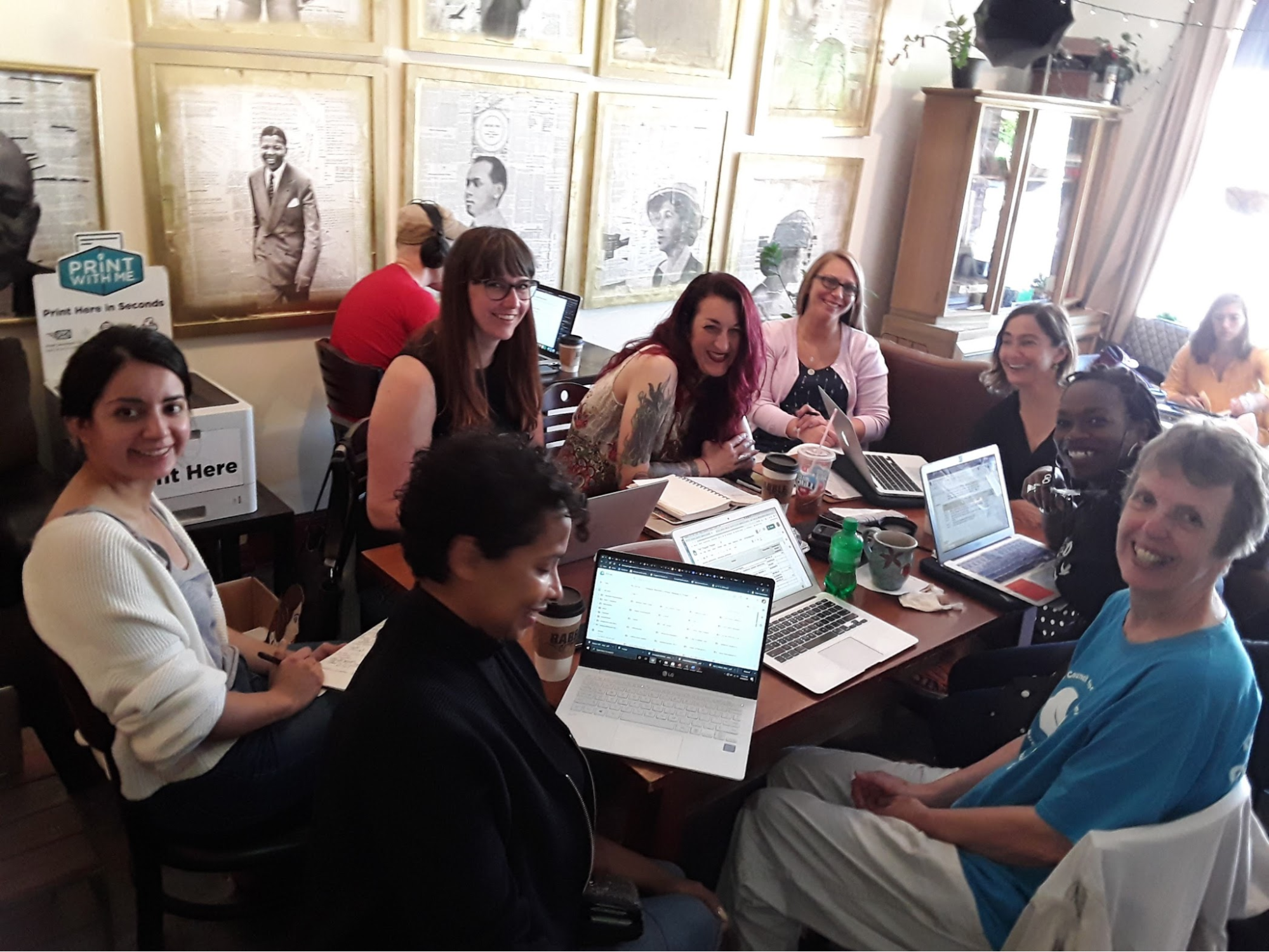 Collaborating on the book at Rabble Coffee Shop, Indianapolis, November 2019: (clockwise from left) Marlen Huesca, Monica Deck, Anastazia Schmid, Molly Whitted, Micol Seigel, Michelle Daniel Jones, Kelsey Kauffman, Elizabeth Nelson
