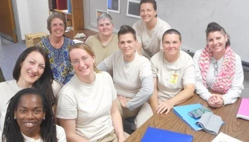 Some of the history project scholars participated in an Inside/Out Prison Exchange class with IU students. Women in khakis are prison residents. Other students are from Indiana University. Top left is Professor Micol Seigel who was a key mentor in the History Project. Women in the photo who were members of the Prison History Project are Lisa Hotchstetler, Lori Record Logan, Natalie Medley, Michelle Williams, Michelle Daniel Jones, and Toni Burns